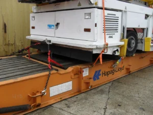 We were instructed to arrange the shipping of an Airport Cargo Scissor lift machine from Heathrow to final destination Christchurch, New Zealand. Due to the extremely low ground clearance of the machine we had to position a mobile crane to lift the item up on the back of the trailer we had positioned. As we were operating within restricted airspace it was necessary to notify the airport authorities that there would be a crane operating with an extended jib in the air within close proximity to the run way. Once the item was loaded to the trailer we had it delivered to our cargo handling partners in Southampton docks and it was then loaded to a 40’ Flat Rack container for export to New Zealand. This whole process only took 4 hours to complete on a Friday afternoon, the key to a smooth operation is good planning.